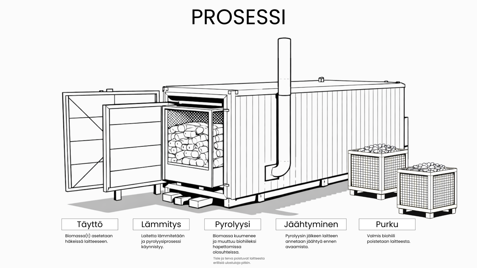 Biomassan kosteusprosentti max. 25%. Tätä kosteampi biomassa on kuivattava ennen prosessia, jotta syntyy laadukasta biohiiltä.